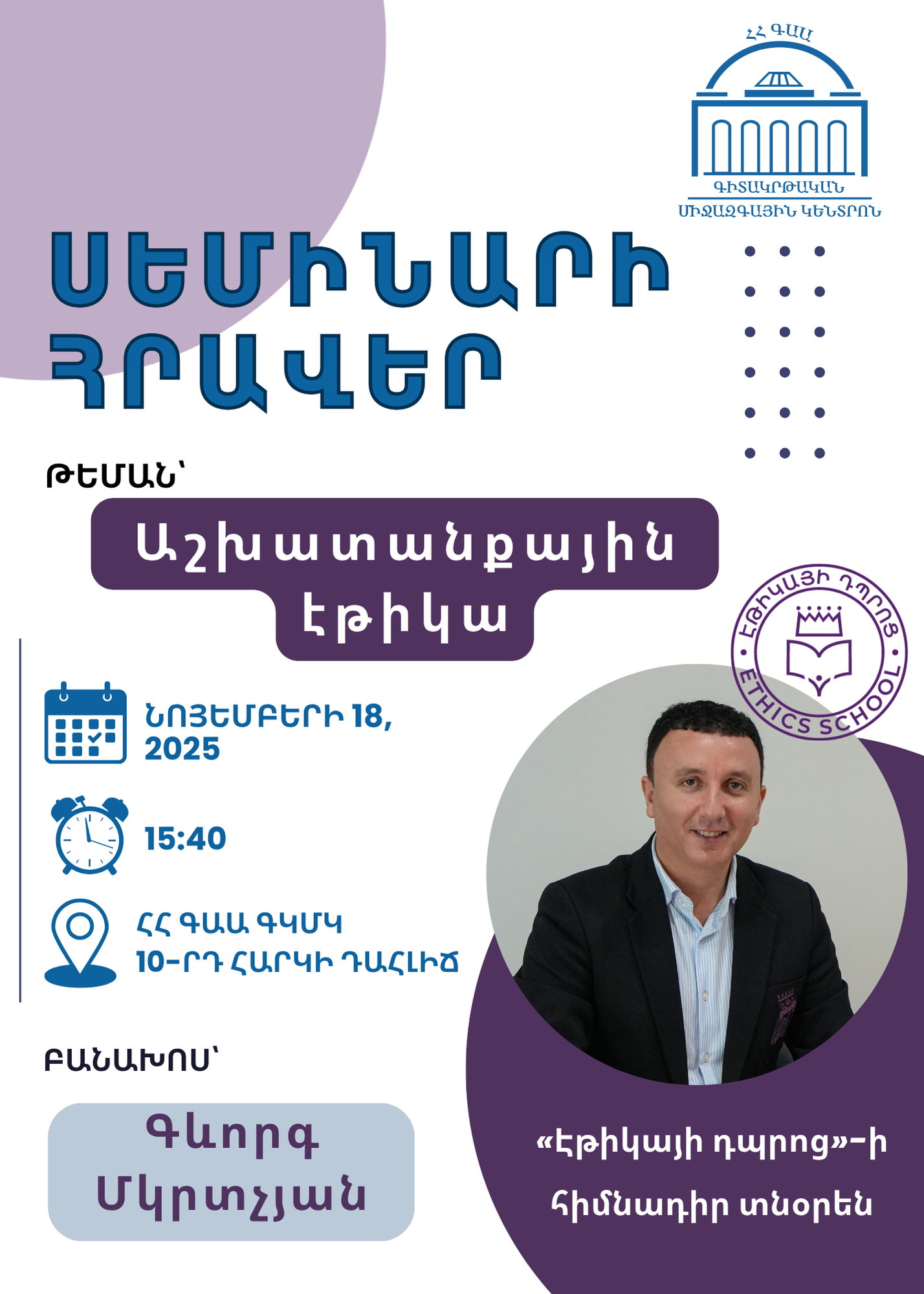 Նոյեմբերի 12, 2025ՀՀ ԳԱԱ գիտակրթական միջազգային կենտրոնի հանրային կապերի և կարիերայի բաժինը ԳԿՄԿ ուսանողներին, շրջանավարտներին և աշխատակիցներին հրավիրում է աշխատանքային էթիկային նվիրված սեմինարի։