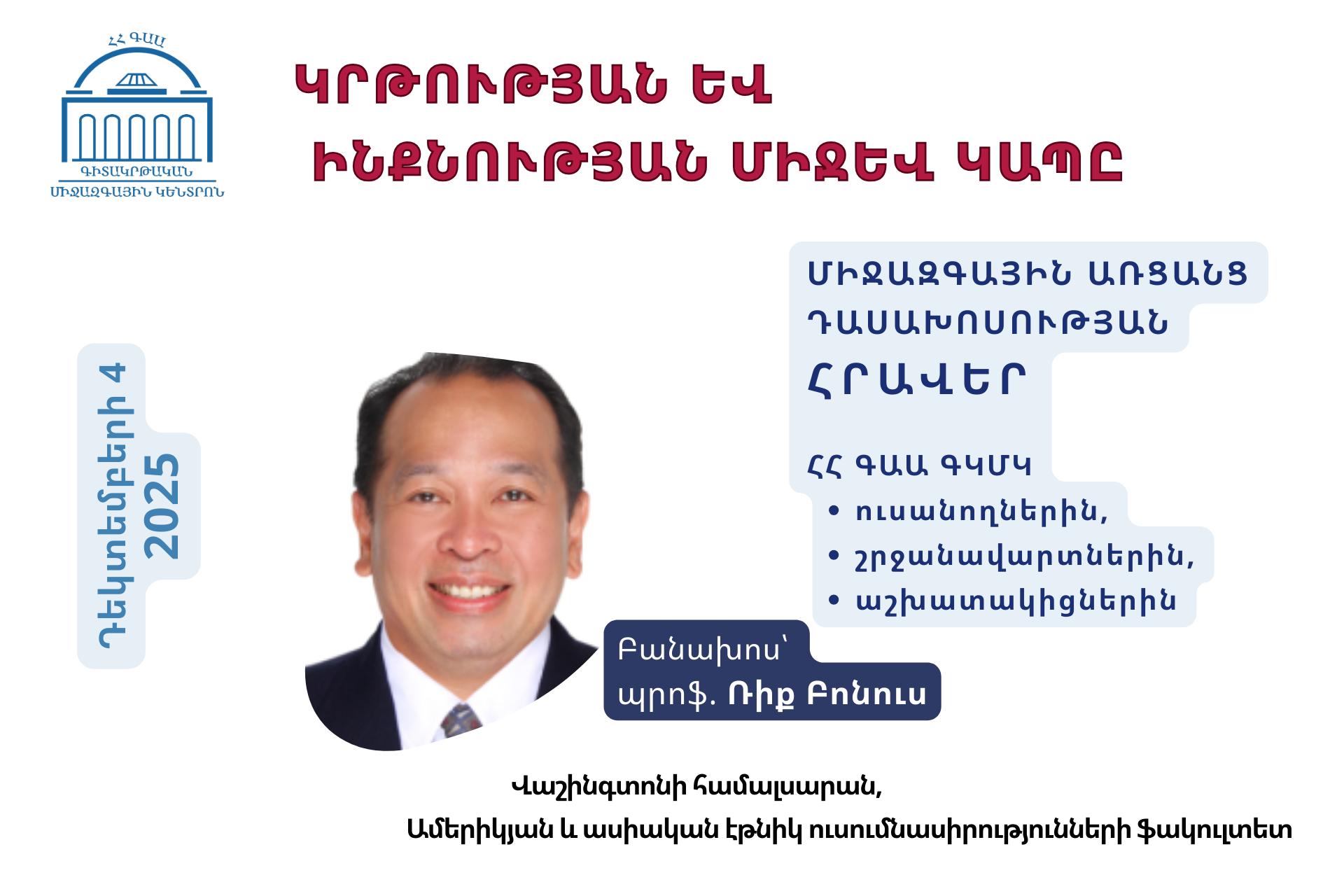 Նոյեմբերի 27, 2025ՀՀ ԳԱԱ ԳԿՄԿ հարգելի՛ ուսանողներ, շրջանավարտներ և աշխատակիցներ, դուք հրավիրված եք միջազգային առցանց դասախոսության, որը կկայանա 2025թ. դեկտեմբերի 4-ին՝ ժ. 9։00-ին։