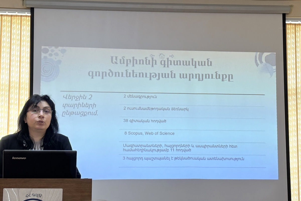 Հատուկ կարևորությամբ ընդգծվեց, որ անցած 2 տարիների ընթացքում ամբիոնը իրականացրել է գիտական դրամաշնորհային ծրագրով թիմային աշխատանքներ, որոնցում ակտիվորեն ընգրկված են եղել նաև ամբիոնի մագիստրանտները՝ դրսևորելով մեծ հետաքրքրվածություն և աշխատանքային արդյունավետություն: