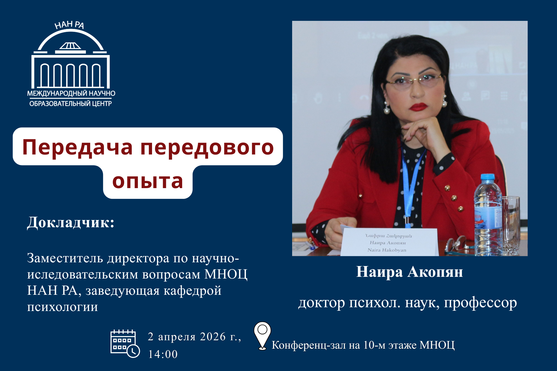 В рамках цикла встреч, направленных на распространение передового университетского опыта, предусмотренных Программой совершенствования и организуемых Отделом обеспечения качества образования МНОЦ НАН РА, 2 апреля 2026 года в 14:00 в конференц-зале на 10-м этаже кафедра психологии МНОЦ НАН РА представит лучшие практики интеграции образования и науки, а также организации магистерского образования на основе сотрудничества «работодатель–вуз».