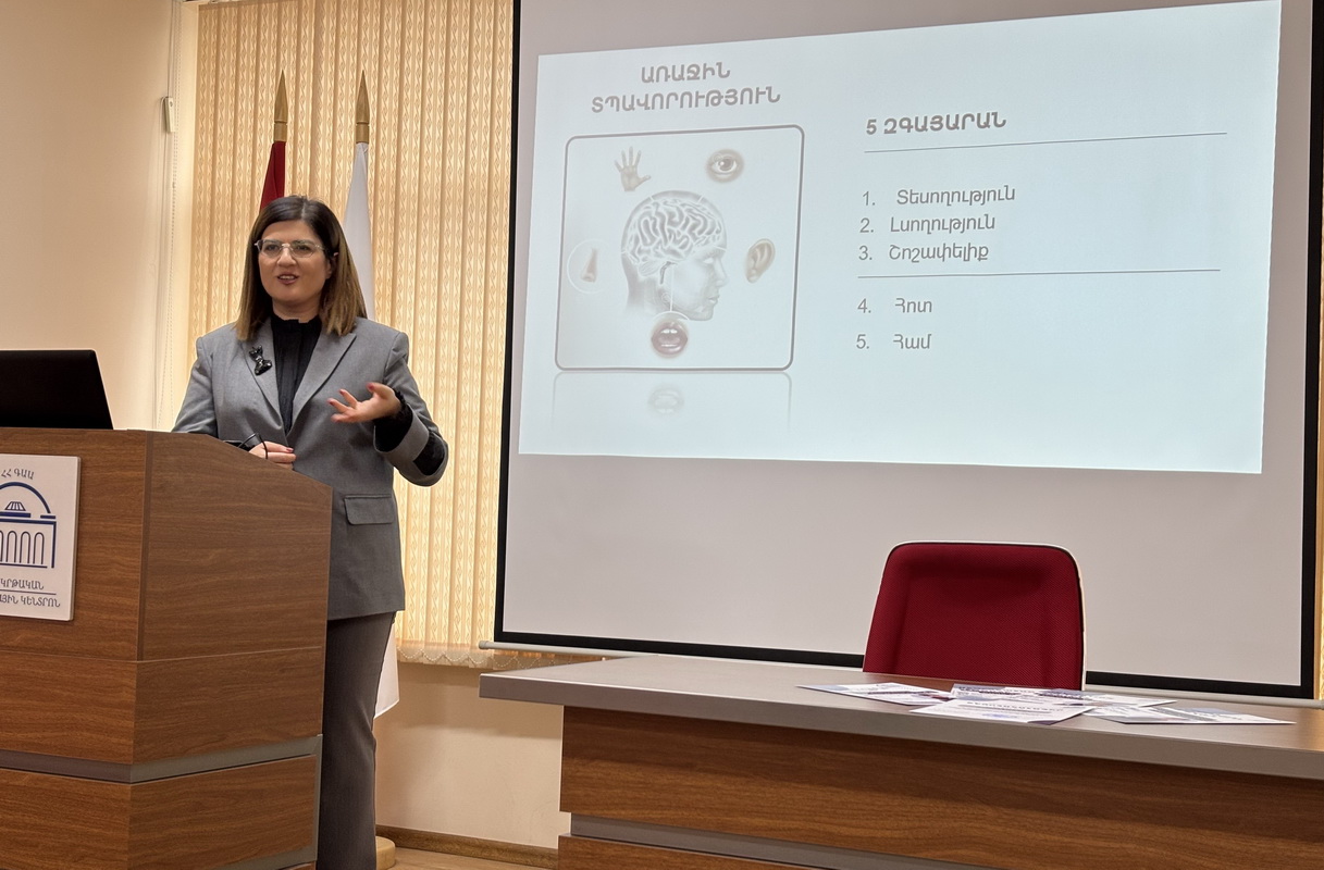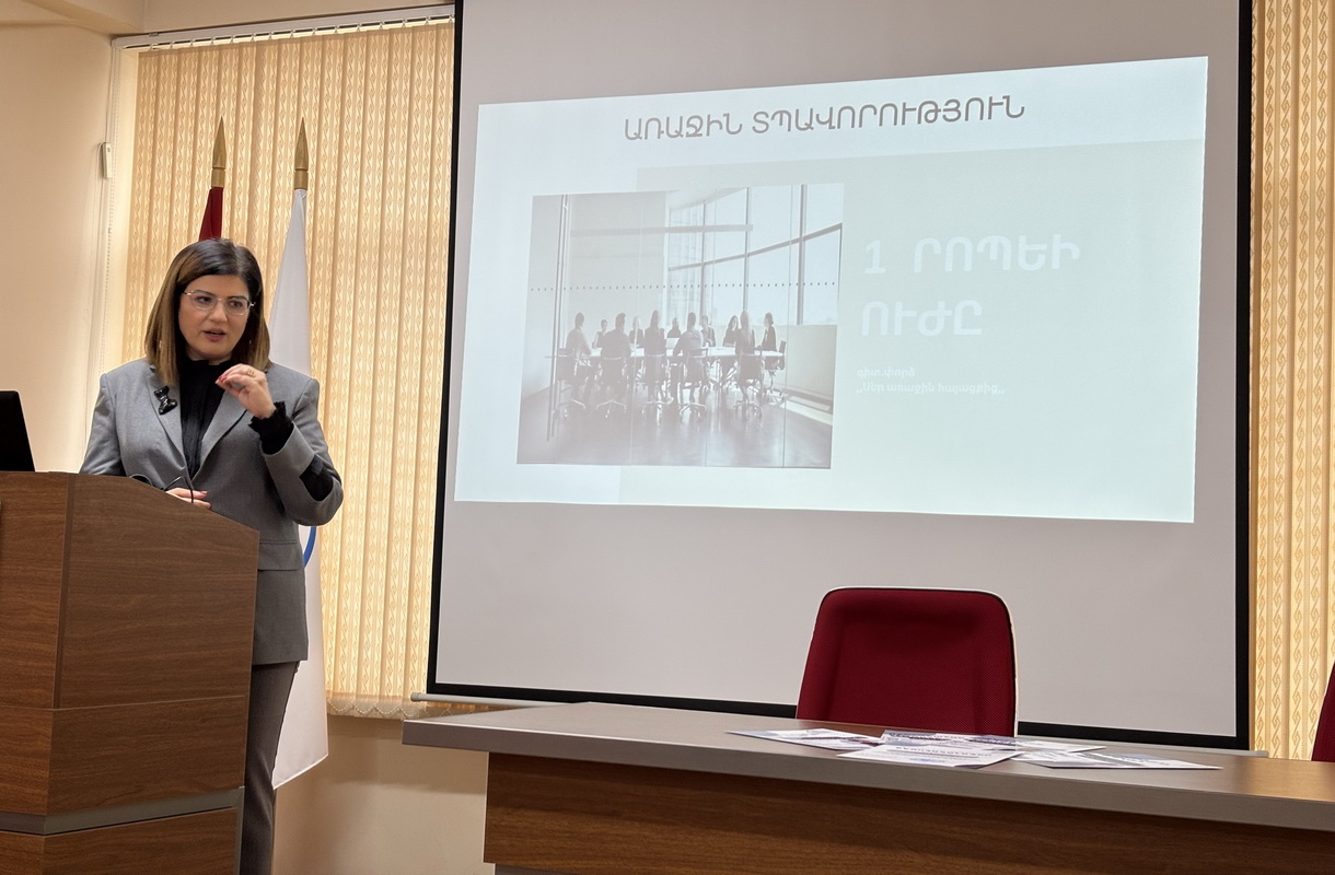 Докладчиком выступила основатель Армянской ассоциации этики и этикета Сюзанна Габриелян, которая с большим энтузиазмом приняла приглашение и поделилась с аудиторией своим опытом в области этики, в частности секретами создания благоприятного первого впечатления в рабочей среде.