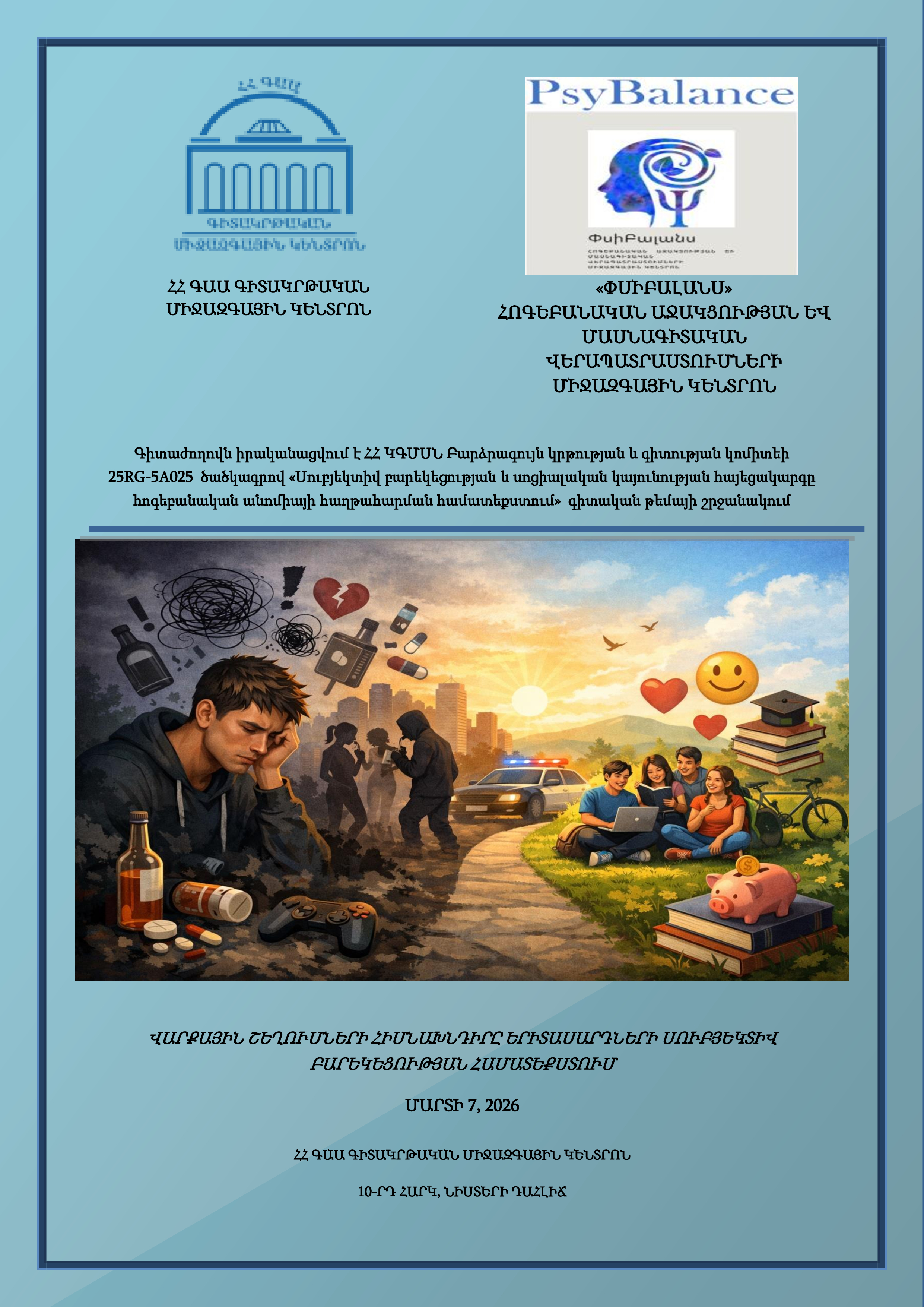Մարտի 4, 2026ՀՀ ԳԱԱ գիտակրթական միջազգային կենտրոնը հրավիրում է բոլոր հետաքրքրվածներին՝ որպես ունկնդիր մասնակցելու վարքային շեղումների հիմնախնդիրներին նվիրված հոգեբանական գիտաժողովի։