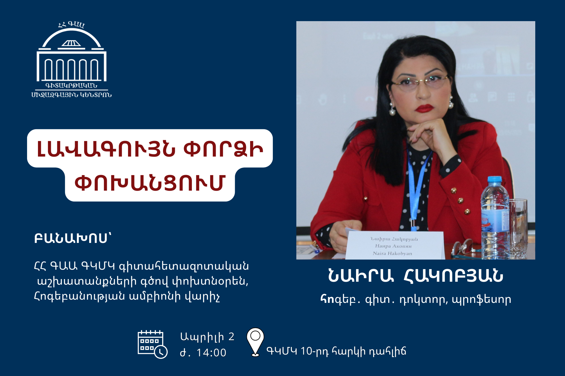 ՀՀ ԳԱԱ ԳԿՄԿ կրթության որակի ապահովման բաժնի կողմից կազմակերպվող Բարելավման ծրագրով նախատեսված բուհի լավագույն փորձի փոխանցմանն ուղղված հանդիպումների շրջանակում 2026թ․ ապրիլի 2-ին՝ ժամը 14:00-ին, ԳԿՄԿ 10-րդ հարկի դահլիճում կրթության և գիտության ինտեգրման, գործատու-բուհ համագործակցությամբ մագիստրոսական կրթության կազմակերպման լավագույն փորձը կներկայացնի ՀՀ ԳԱԱ ԳԿՄԿ հոգեբանության ամբիոնը: