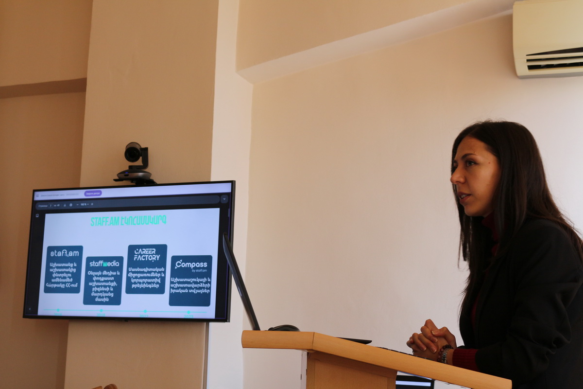 Բանախոսը մեծ պատրաստակամությամբ ներկայացրեց staff.am հարթակի լայն հնարավորությունները, արդի աշխատաշուկայի ընդհանուր բնութագիրը, ցանկալի աշխատանք գտնելու գործողություններն արդյունավետ դարձնելու որոշ գաղտնիքներ: Հատուկ անդրադարձ կատարվեց մրցունակ CV և մոտիվացիոն նամակ գրելու նրբություններին: