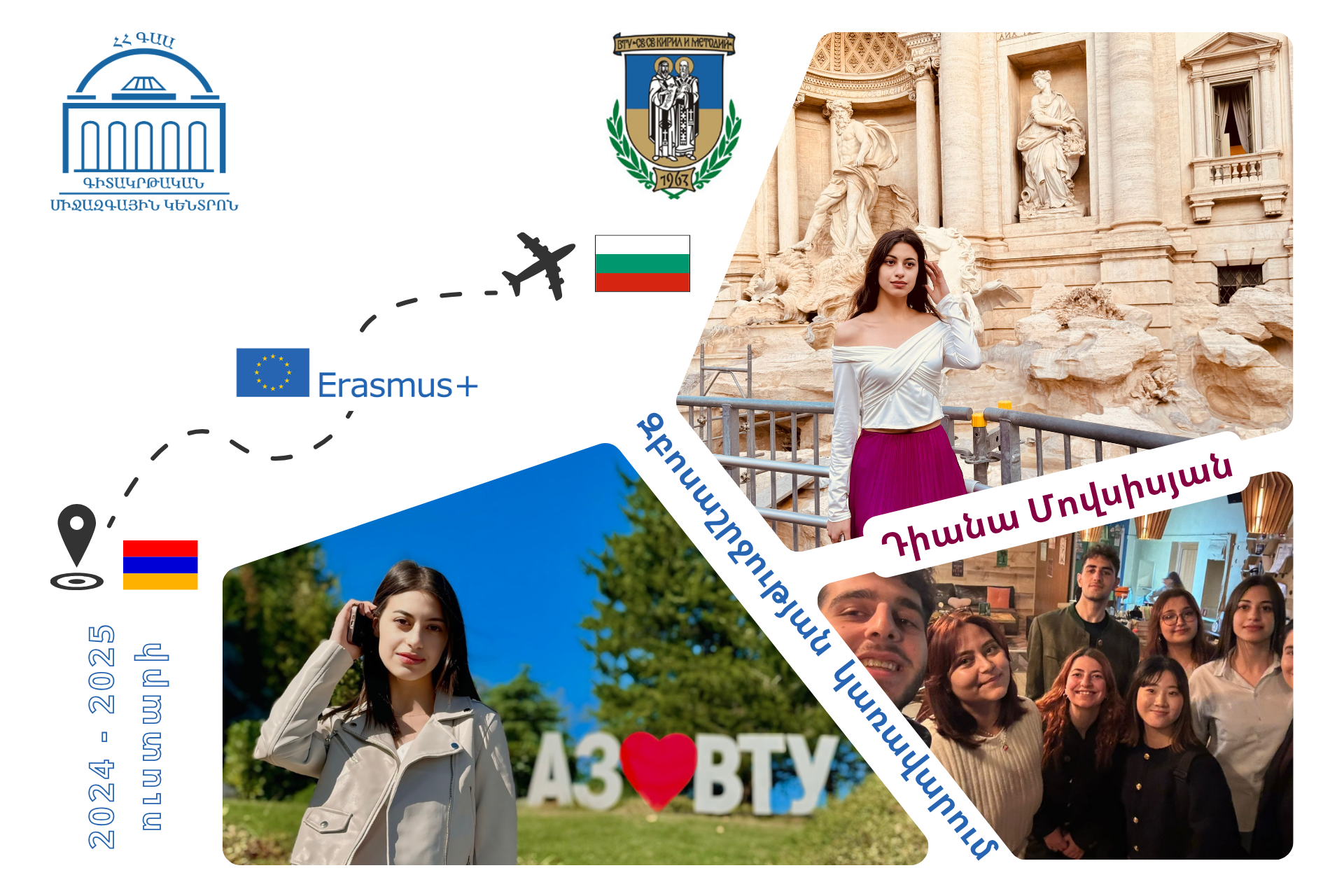 ՀՀ ԳԱԱ գիտակրթական միջազգային կենտրոնի (ԳԿՄԿ) «Զբոսաշրջության կառավարարում» մասնագիտության 2025թ․ գերազանց շրջանավարտ Դիանա Մովսիսյանը Erasmus+ ուսանողների շարժունության ծրագրի շրջանակներում 1 կիսամյակ ուսանել է Բուլղարիայում՝ Վելիկո Տառնովոյի «Սուրբ Կյուրեղ և Մեթոդիոս» համալսարանում։ Հարցազրույցում Դիանան կիսում է իր տպավորությունները։