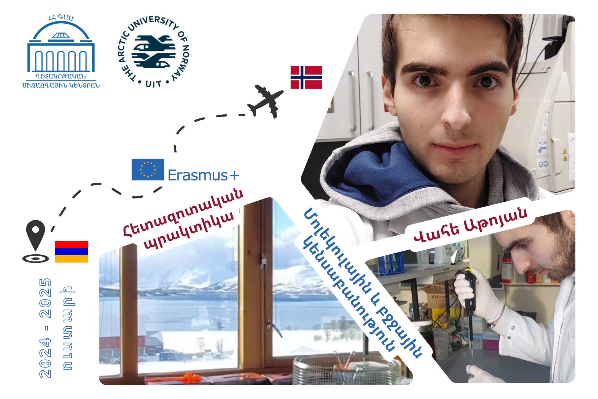 ՀՀ ԳԱԱ գիտակրթական միջազգային կենտրոնի (ԳԿՄԿ) «Մոլեկուլային և բջջային կենսաբանություն» մագիստրոսական կրթական ծրագրի 2025 թվականի գերազանց շրջանավարտ Վահե Աթոյանը ԳԿՄԿ-ում ուսանելու տարիներին Erasmus+ ծրագրի շրջանակներում կրկնակի հնարավորություն է ունեցել հետազոտական պրակտիկա անցնելու Նորվեգիայի արկտիկական համալսարանում (UiT)։